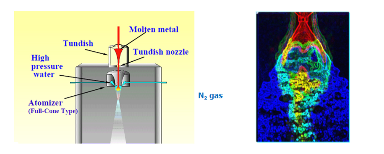 霧化器結(jié)構(gòu)如圖所示,采用此結(jié)構(gòu)設(shè)計有如下好處:單一霧化器中實(shí)現(xiàn)二步霧化,先是氣體打擊霧化,后是超高壓水打擊水霧化;第一步氣體預(yù)破碎并冷卻鋼液,使鋼液液流形成液波及破裂鋼帶,第二步充分利用超高壓水的動能,進(jìn)一步打擊液流及破裂鋼帶,使之變形和細(xì)化成為細(xì)小的顆粒粉末;采用該霧化器制備的粉末為近似球形,兼?zhèn)錃忪F化的優(yōu)異性能,同時細(xì)粉產(chǎn)出率高。
